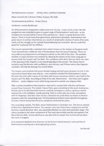 Vespers and The Bells. According to Potts in his talk, Rachmininov -- like Holst and Vaughan